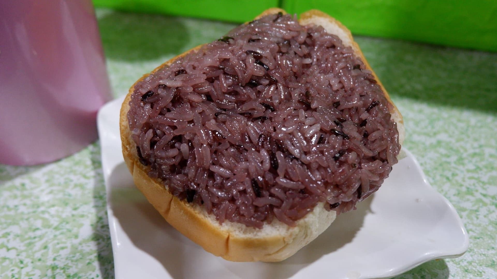 Carbs on carbs. Bread topped with Tapul, a purple sticky rice.
